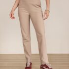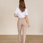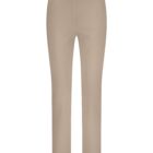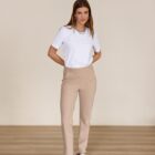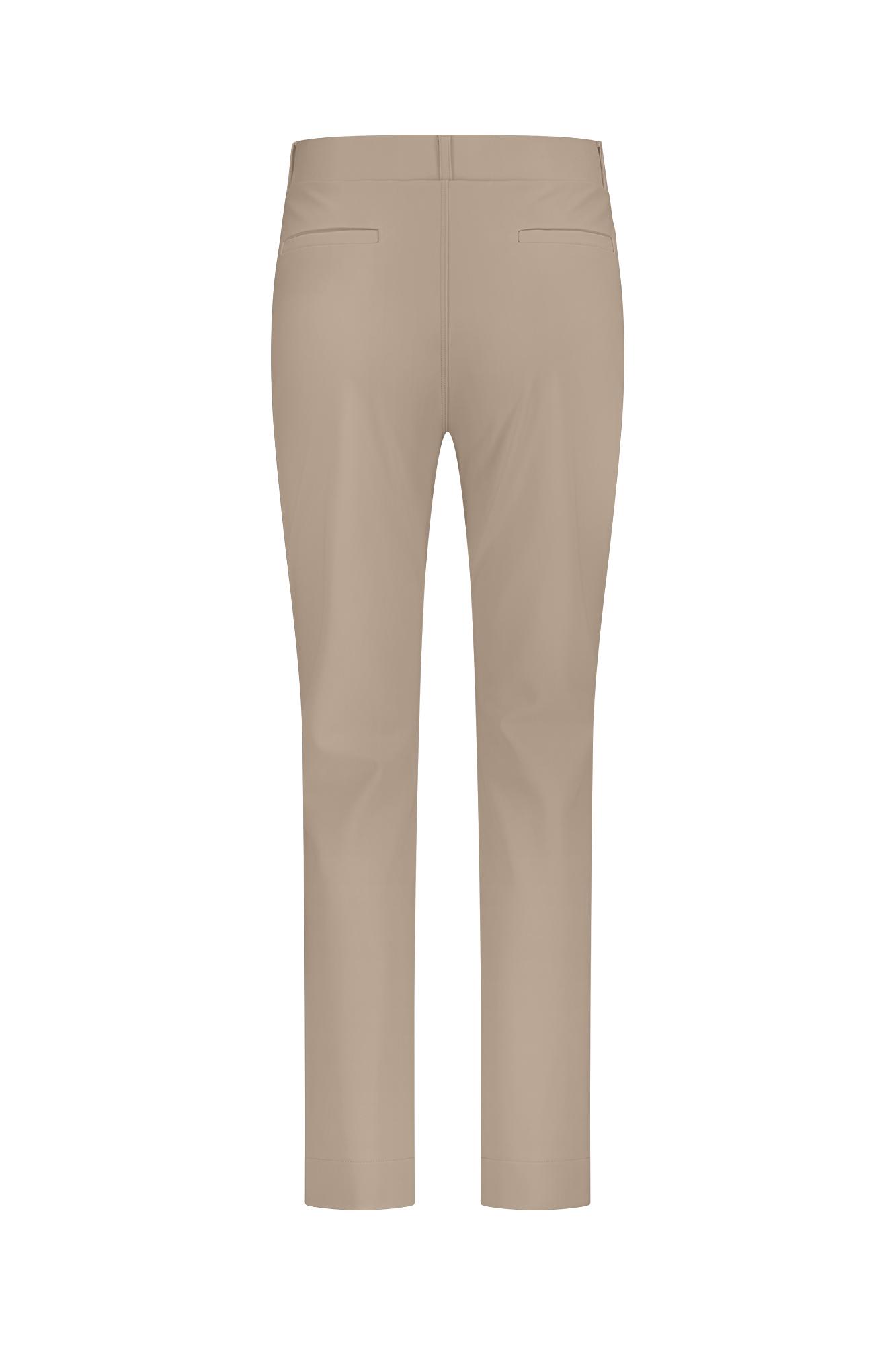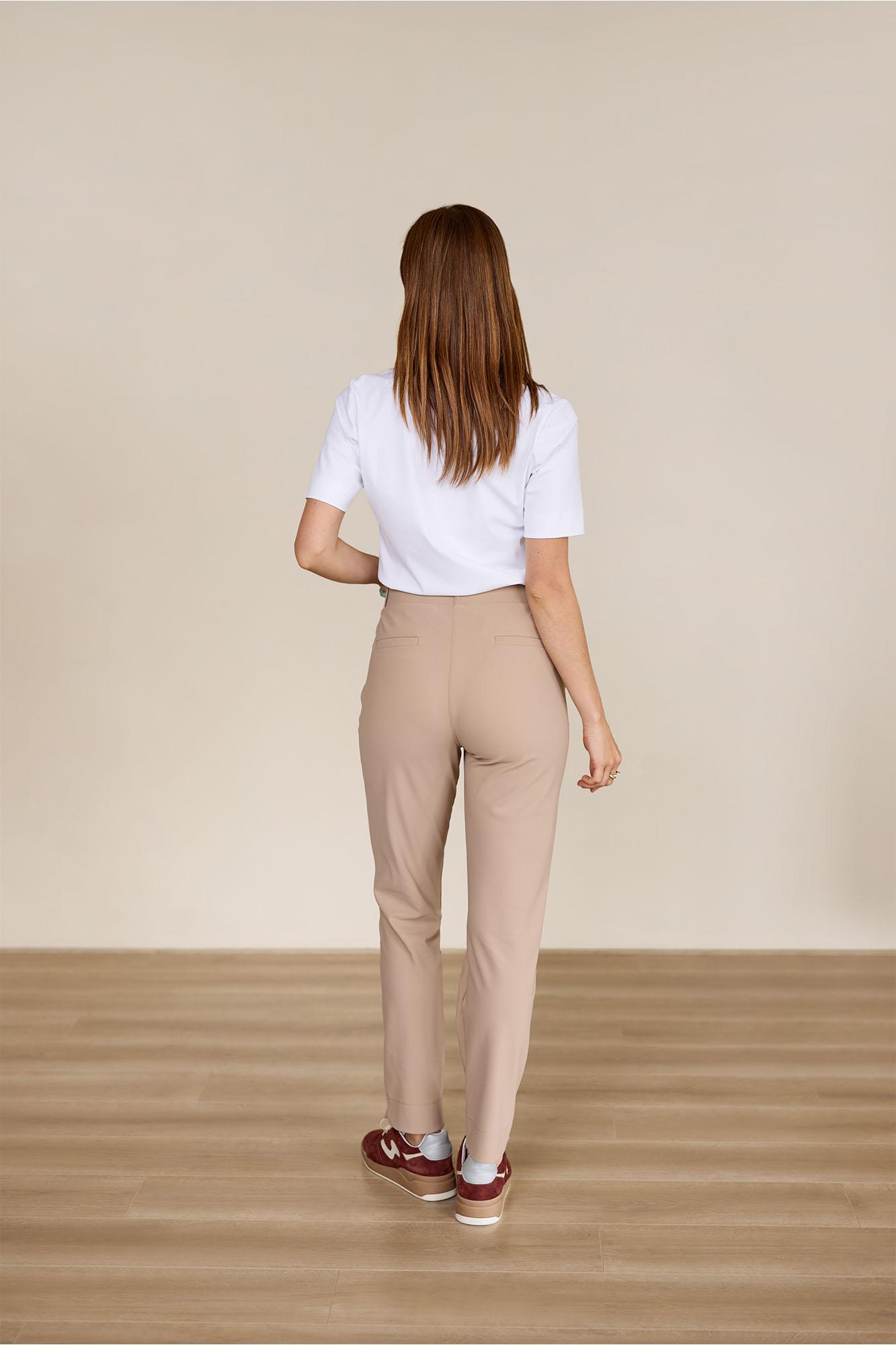 Deze Latte broek is gemaakt van Bonded Travelstof. Dit materiaal voelt stevig aan, biedt veel stretch en blijft mooi in vorm, zelfs na een lange dag dragen. De tapered fit zorgt voor een slanker silhouet, terwijl de splitjes onderaan de pijpen een speels detail toevoegen.