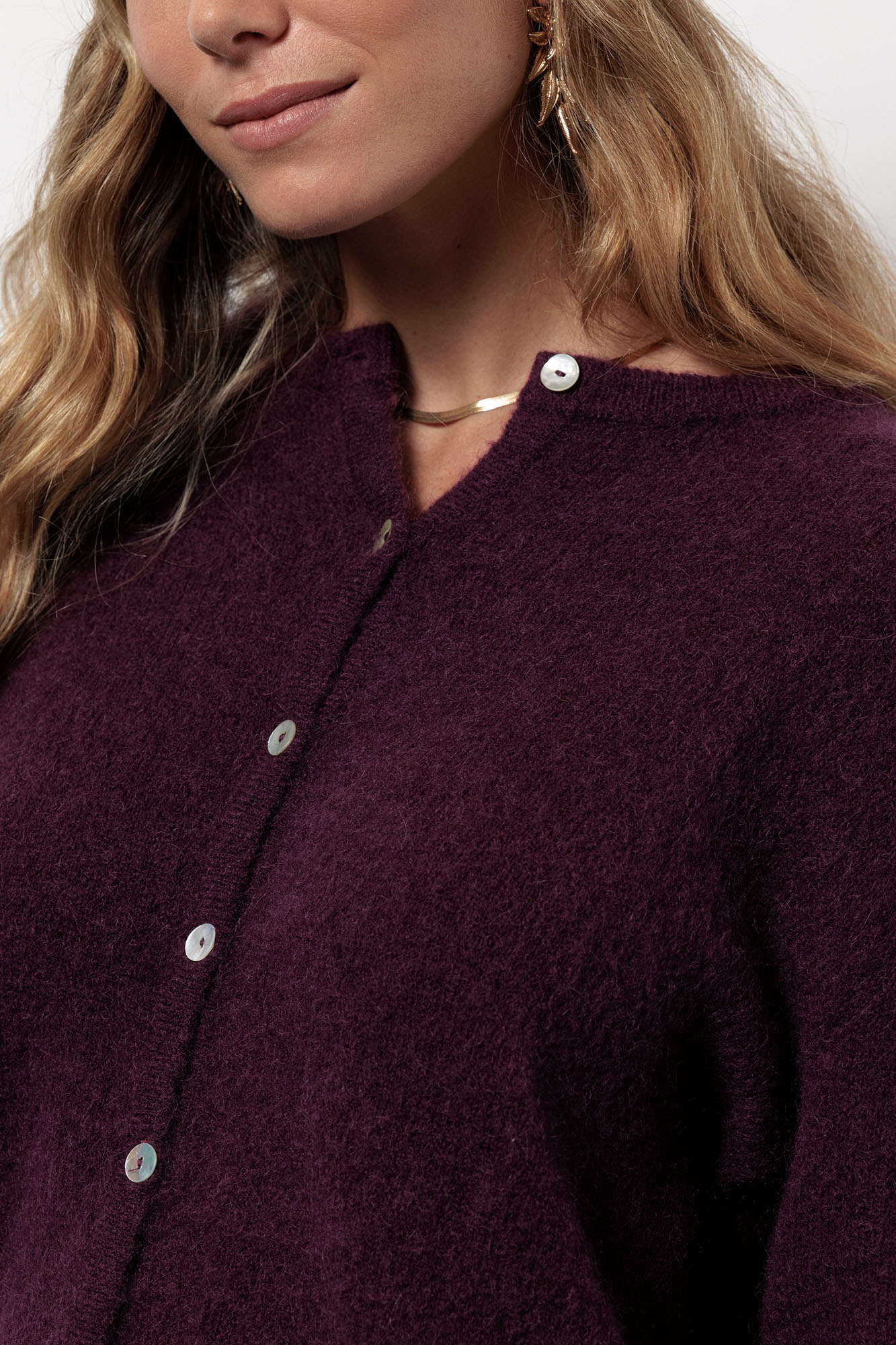 De Bibi mohair cardigan in de kleur Blackberry is een elegant vest met een moderne twist. De diepe paarsrode tint voegt warmte en karakter toe aan je outfit, terwijl de zachte wol- en mohair mix zorgt voor een luxe uitstraling. Dankzij de regular fit draagt het vest comfortabel en valt het losjes om het lichaam.