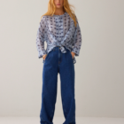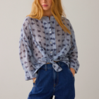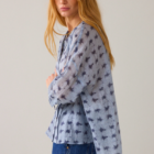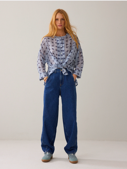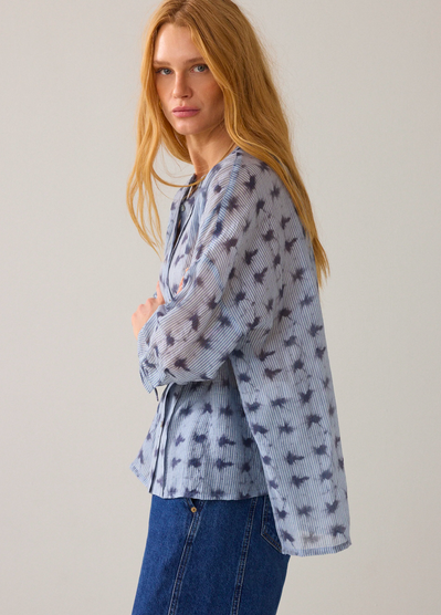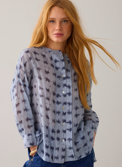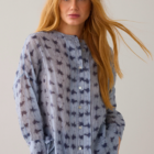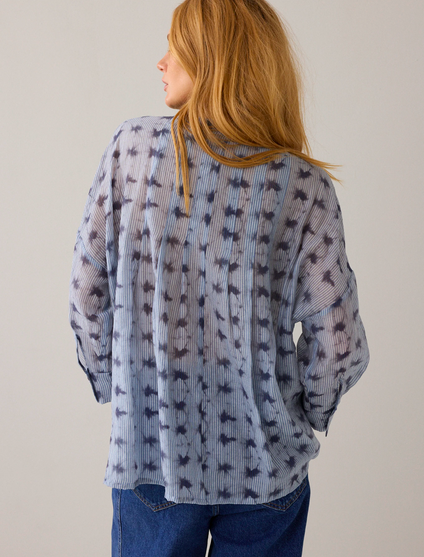 Wear-your-way overhemdblouse van licht transparante stof met tie-dye streepprint en een verlaagde schouderinzet. De korte knoopsluiting en hoge splitten maken het mogelijk om de blouse op verschillende manieren te dragen: losvallend als blouse voor een relaxte look of aan de voorkant gestrikt voor een feminine shape.