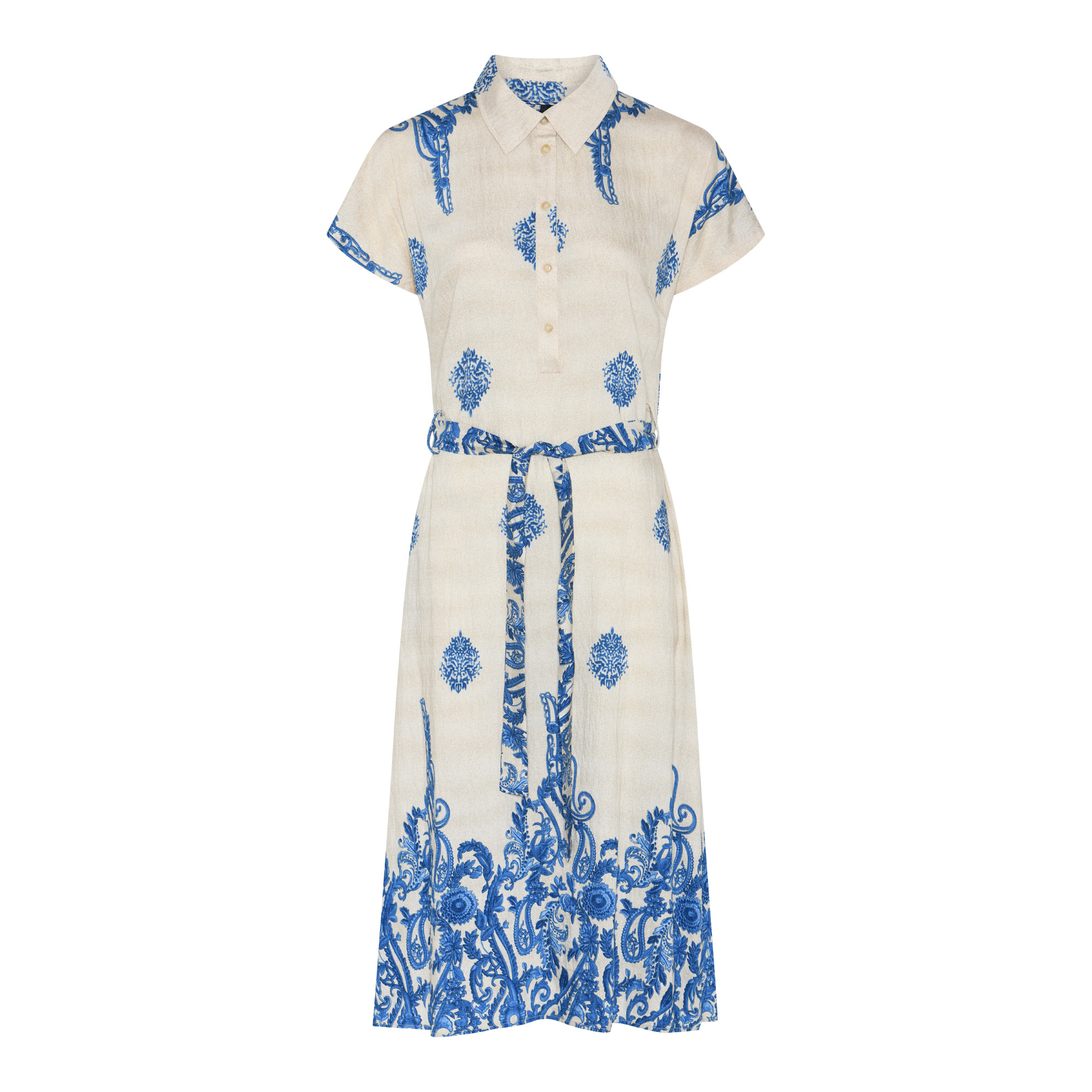 Long shirt dress with a classic collar, short sleeves and button closure. The beautiful blue print and tie belt at the waist give a feminine and elegant look.