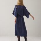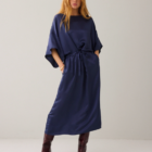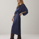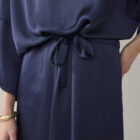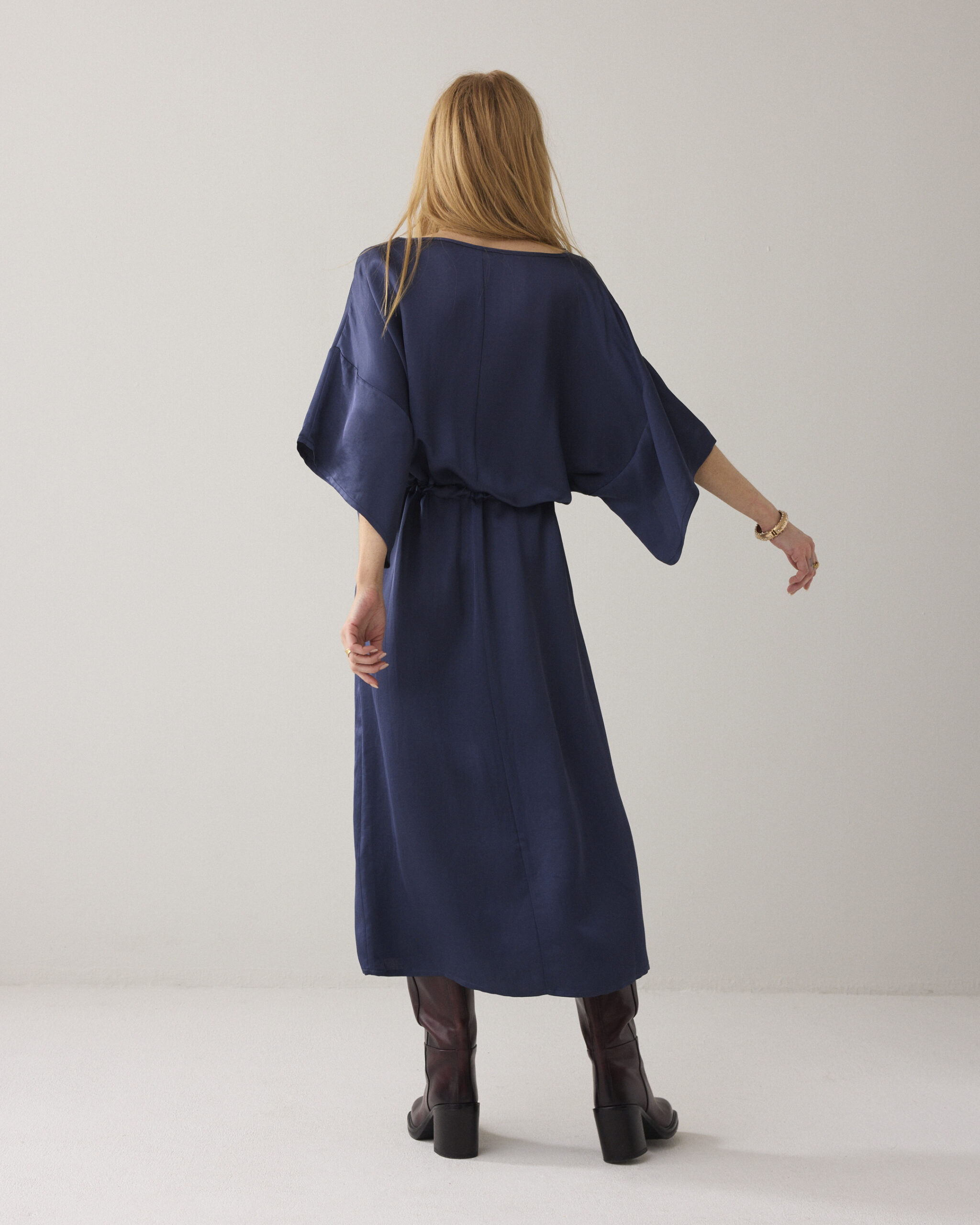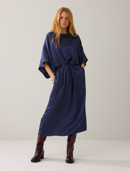 Jurk van soepelvallende heavy silky kwaliteit met een lichte glans. De jurk heeft een boothals met afgebiesde rand, wijde rechte mouwen met verlaagde schoudernaad en een aangerimpelde taille met strikkoord in een tunnel.