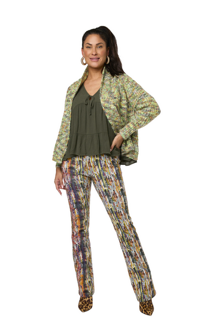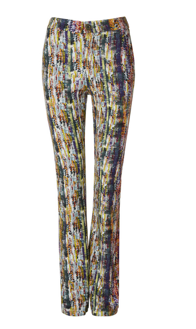 De Eva Flare Melange Broek is een mooie zacht aanvoelende broek met wijd uitlopende pijpen. De broek heeft een rits aan de voorzijde en een knoop en een sluit koord aan de bovenzijde om de broek goed te kunnen sluiten. Te combineren met de Danka Melange Gilet.