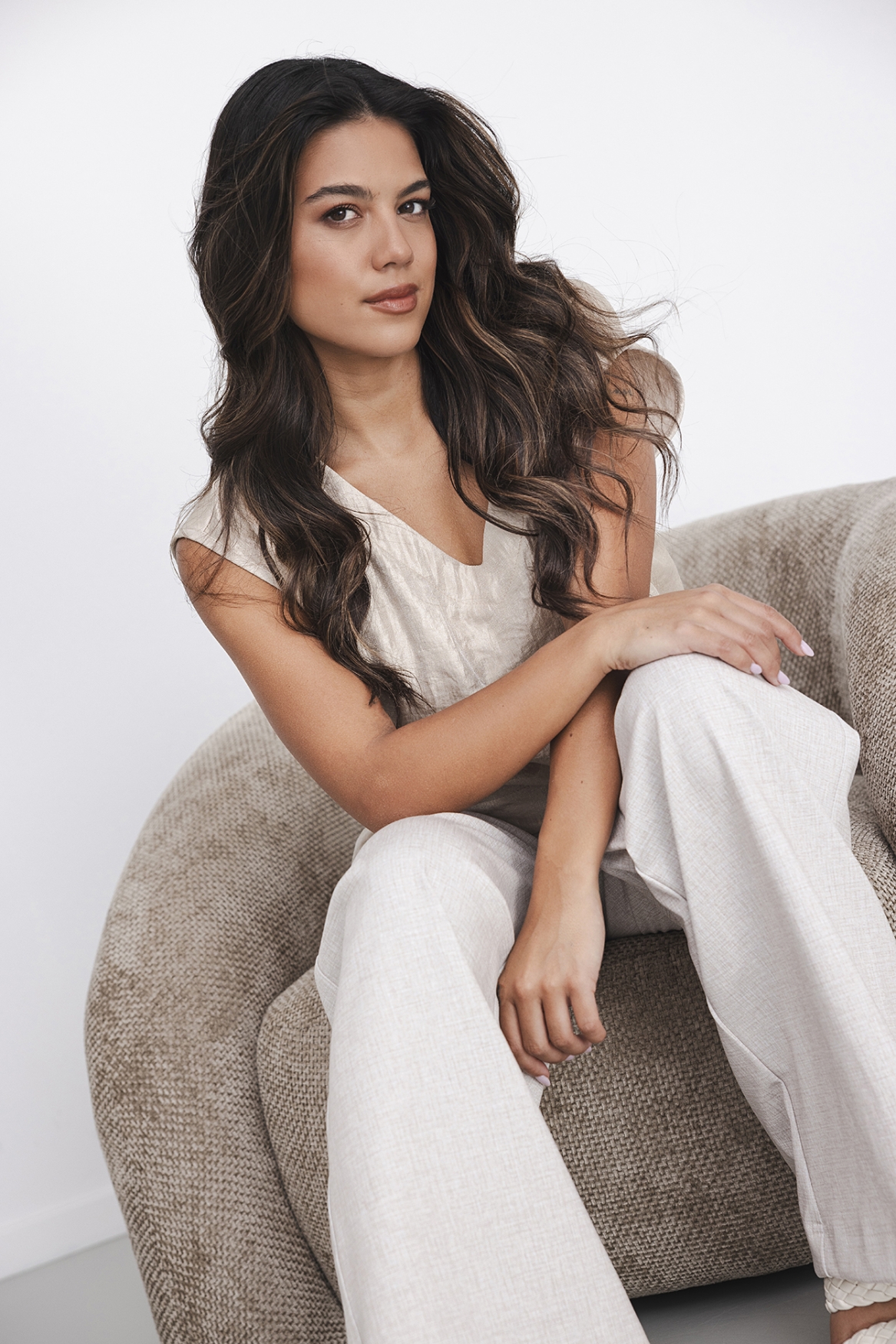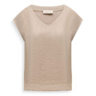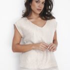 Deze top is gemaakt van een hoogwaardige organza‑stof die direct een luxe, luchtige uitstraling geeft. De subtiele textuur van de stof zorgt voor een elegante glans, terwijl de V‑hals en mouwloze snit het geheel een vrouwelijke, moderne look geven. De top valt soepel en licht, waardoor hij zowel comfortabel als chic oogt.