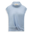 Deze lichtblauwe top is gemaakt van een hoogwaardige denim satin stof: een unieke combinatie van de van denimlook en de elegante glans van satijn. Het resultaat is een soepelvallende, luxe top die zacht aanvoelt en prachtig meebeweegt. De hoge hals geeft het ontwerp een vrouwelijke, verfijnde look, terwijl de relaxte pasvorm en plooi zorgen voor een moeiteloze, flatterende uitstraling.