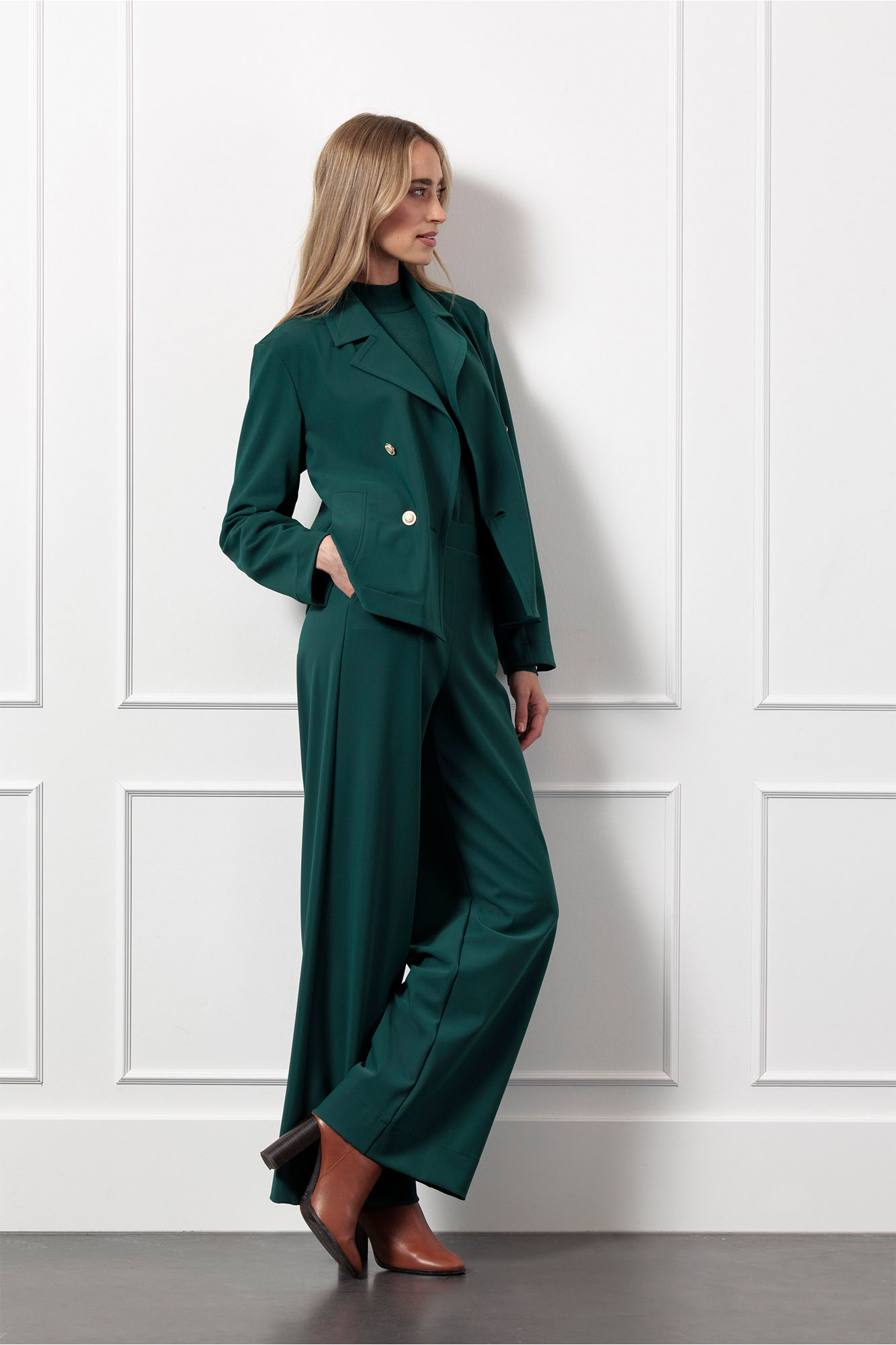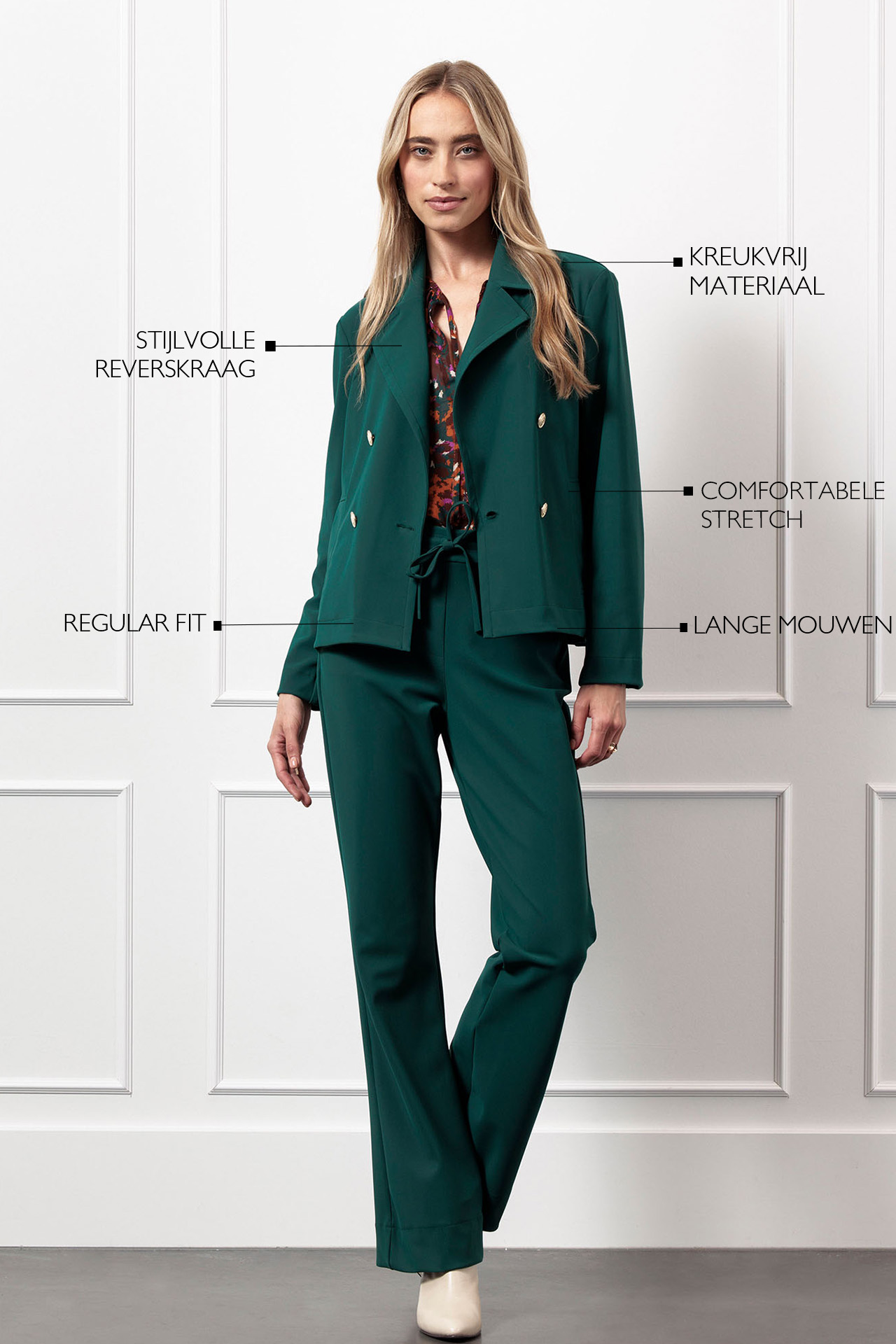 De Bonded Travelstof is vormvast, kreukvrij en voelt prettig aan, waardoor de blazer perfect is voor zowel zakelijke afspraken als casual momenten. De diepe groene kleur voegt een chique touch toe en laat zich eenvoudig combineren met neutrale tinten of juist met warme kleuren voor meer contrast.