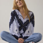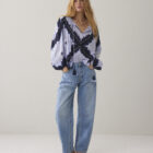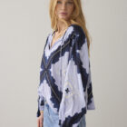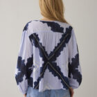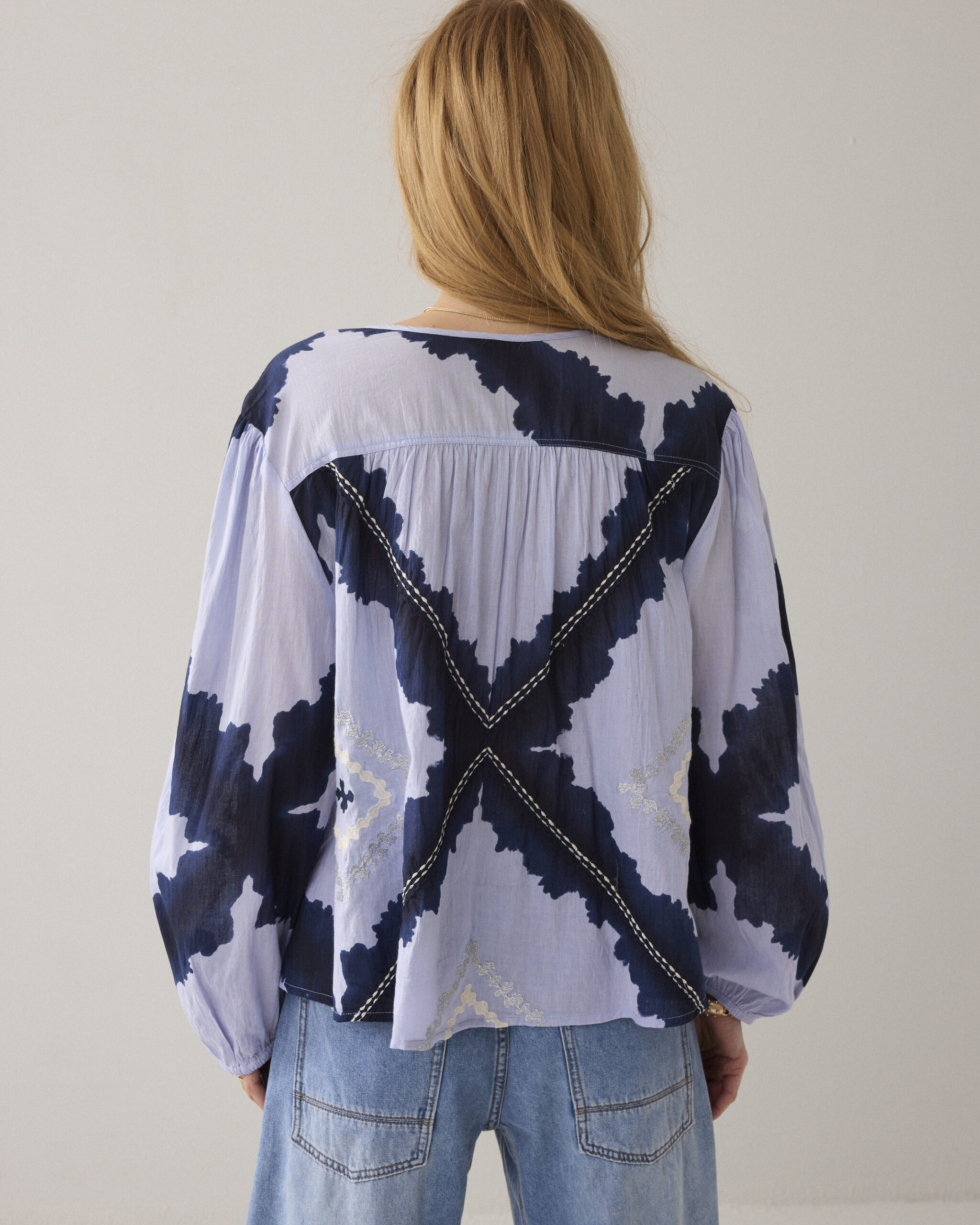 Blouse van luchtige katoenvoile met een zachte tie-dye print in de kleuren van de collectie. Het model heeft geometrische borduursels op de mouwen en voorkant, een koordsluiting met stoffen kwastjes en fijne plooitjes langs de pas.