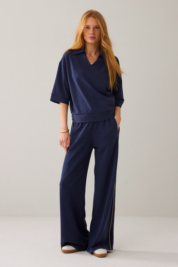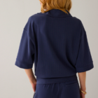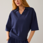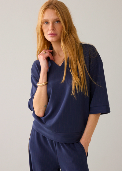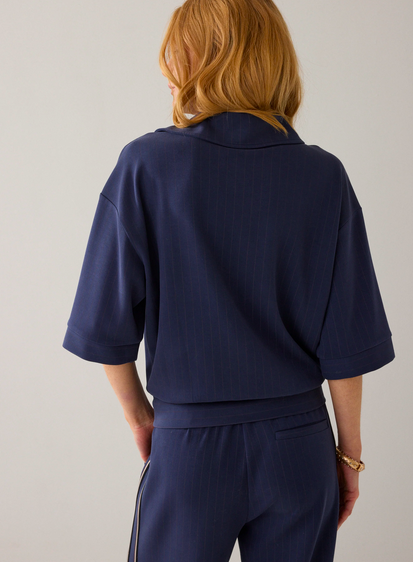 Top van pinstripe soft scuba in een soepele kwaliteit: onze bestseller-stof uit de herfstcollectie. De polo heeft een boxy fit met aangesloten onderkant op de heupen, een polokraag met klein splitje en halflange mouwen met off-shoulder pasvorm.