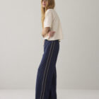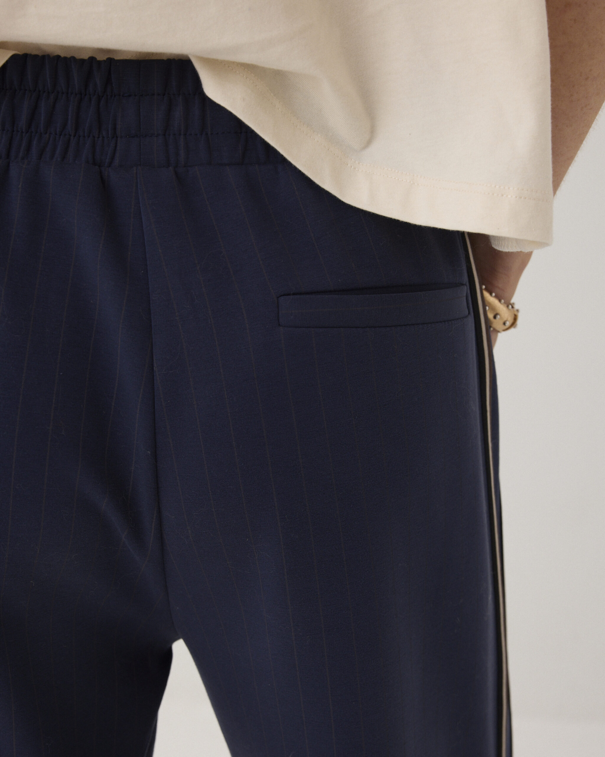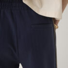 Broek van pinstripe scuba met een elastische tailleband en contrasterend koord. Deze comfy broek heeft wijde pijpen met een sportieve bies op de zijnaad.