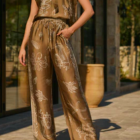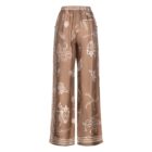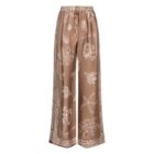 De Valerie pants print van Nukus is een luchtige en stijlvolle broek in een warme fango kleur met een speelse offwhite opdruk in zee-thema. Het soepelvallende materiaal van 50% viscose en 50% rayon zorgt voor een comfortabele pasvorm en een elegante val. Dankzij het lichte en ademende ontwerp is deze broek ideaal voor het voorjaar en de zomer. Combineer de Valerie pants met een top, blouse of t-shirt voor een frisse, casual look met een subtiel opvallend detail. Een perfect item om je garderobe een speels en zomers tintje te geven.